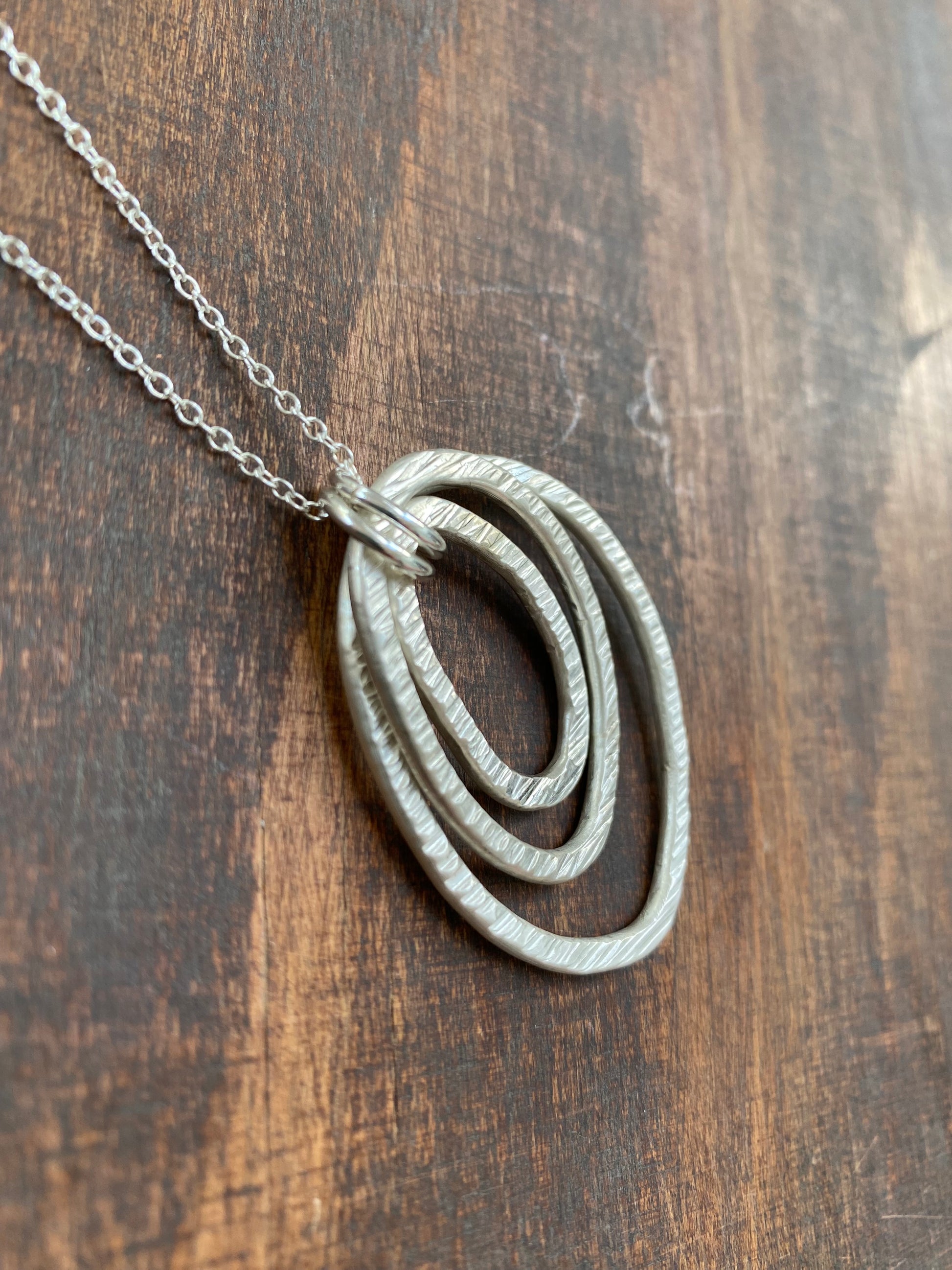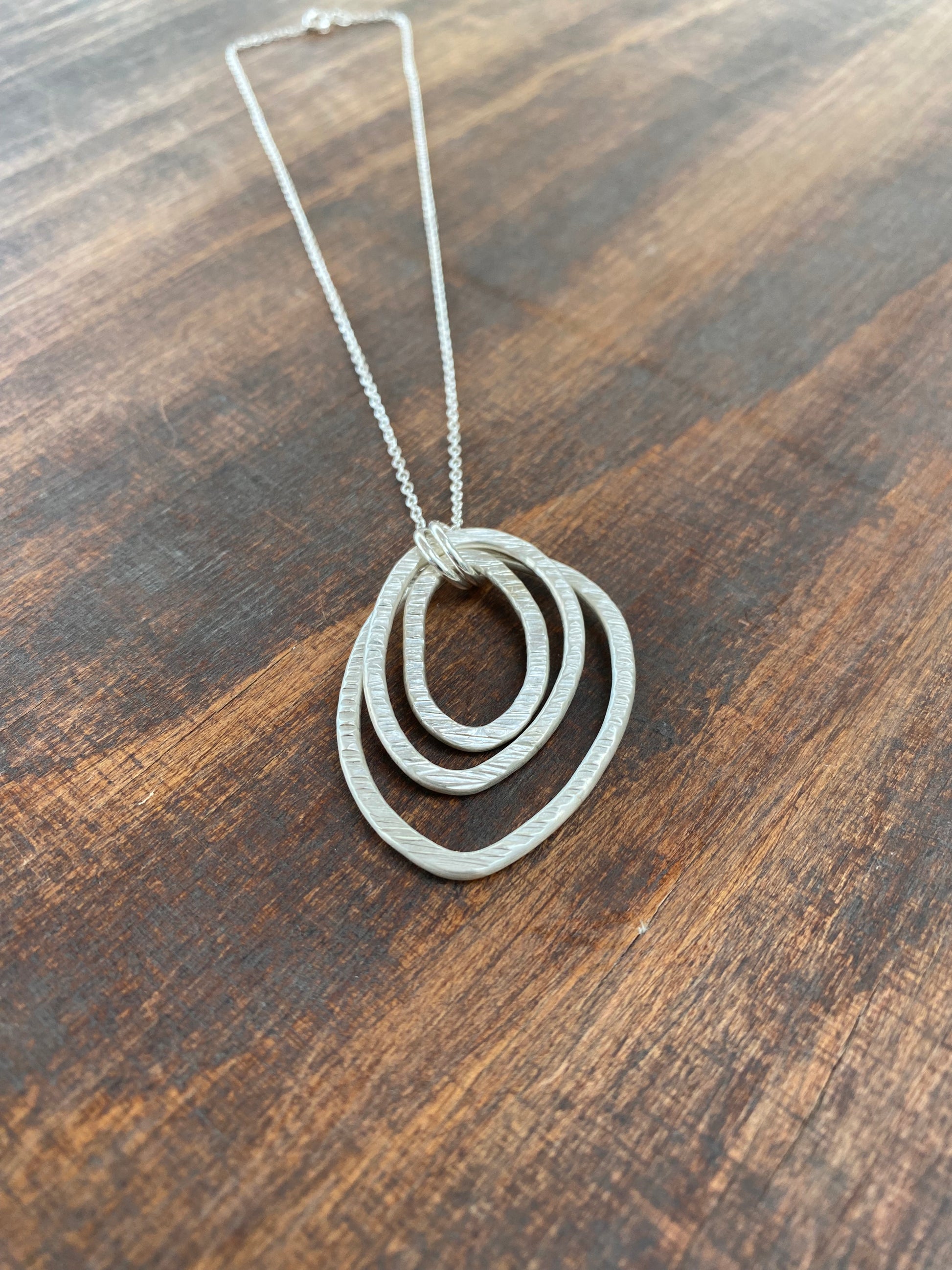 A beautiful organically shaped pendant featuring three different sized circles, each one has a hammered detail on one side and then a smooth none textured reverse side.